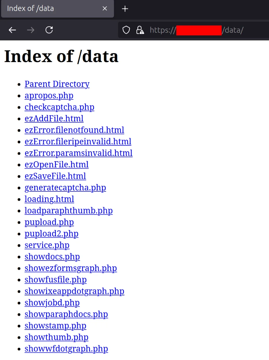 During the initial reconnaissance phase, the application reveals that directory listing is enabled on the /data/ path. Accessing https://<target>/data/ returns a raw index of files and subdirectories hosted in that location. Among the listed files are several .html and .php files.