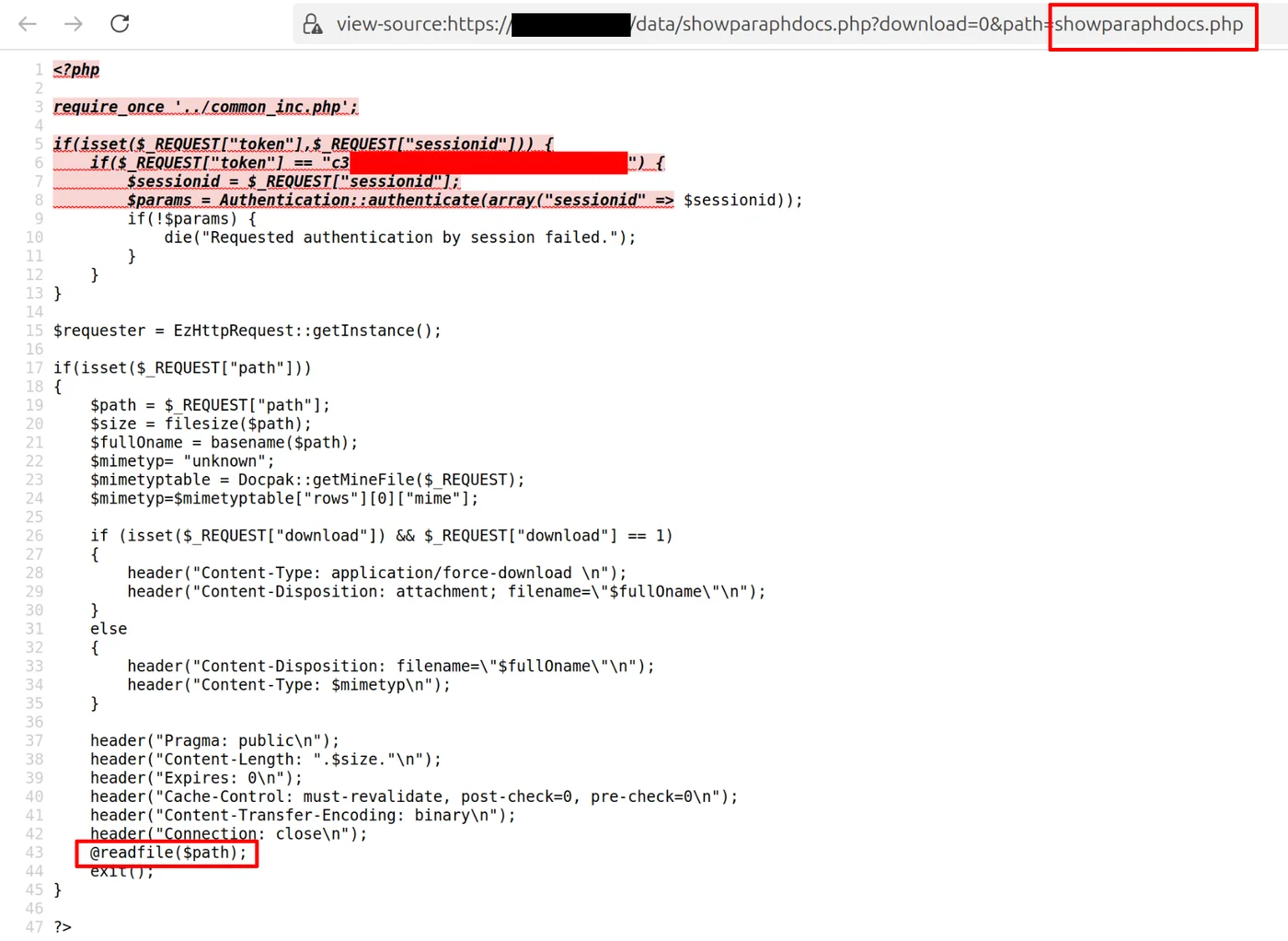In the code, the value of the path parameter is used directly in a call to @readfile($path) without any sanitization or restriction. This function instructs PHP to read the file specified by $path from the server’s filesystem and output its contents directly to the HTTP response.
